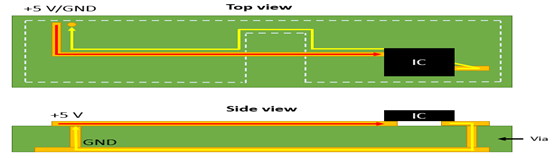 如果您使用的是兩層電路板并且沒有空間放置接地層,則應(yīng)仔細規(guī)劃電路板中的返回路徑,以保持較小的環(huán)路電感。一種選擇是在頂層和底層使用網(wǎng)格布置的接地區(qū)域,并通過過孔將它們連接起來。但是,如果您正在處理高速信號(TTL 和更快),由于PDN 中的電容不足,您會在電源軌上看到較大的電壓波動。這是高速電路板中電源和地平面放置在相鄰層上,而地平面直接放置在信號/元件層下方的主要原因。