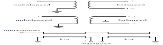 巴倫示例。頂部和中間:兩個(gè)變壓器不平衡變壓器。底部:四分之一波長(zhǎng)巴倫。